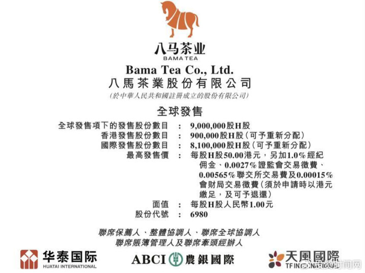 10月20日,八马茶业宣布启动全球发售。据悉,八马茶业本次计划全球发售900万股H股,其中90%为国际发售,10%为公开发售,无超额配股权,招股区间为每股45港元到50港元,最高募资总额为4.5亿港元。公司预计10月28日在港交所挂牌上市,华泰国际、农银国际、天风国际为联席保荐人。